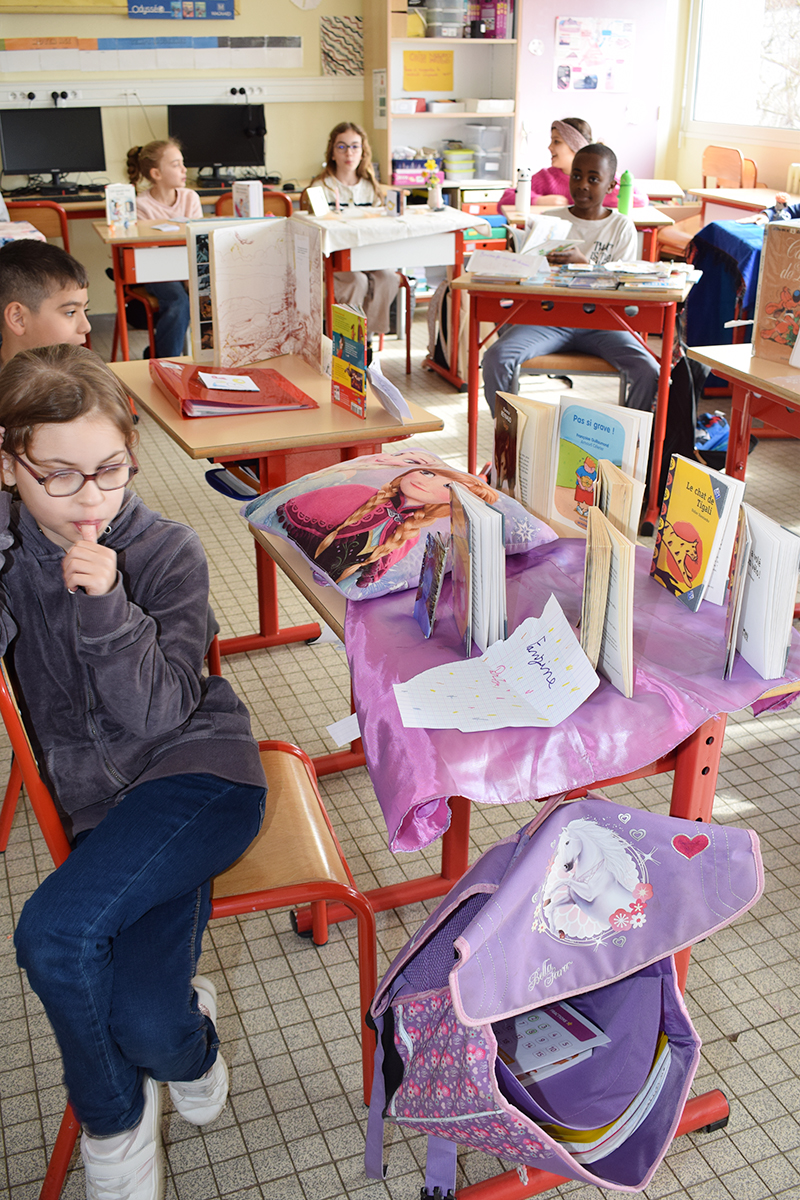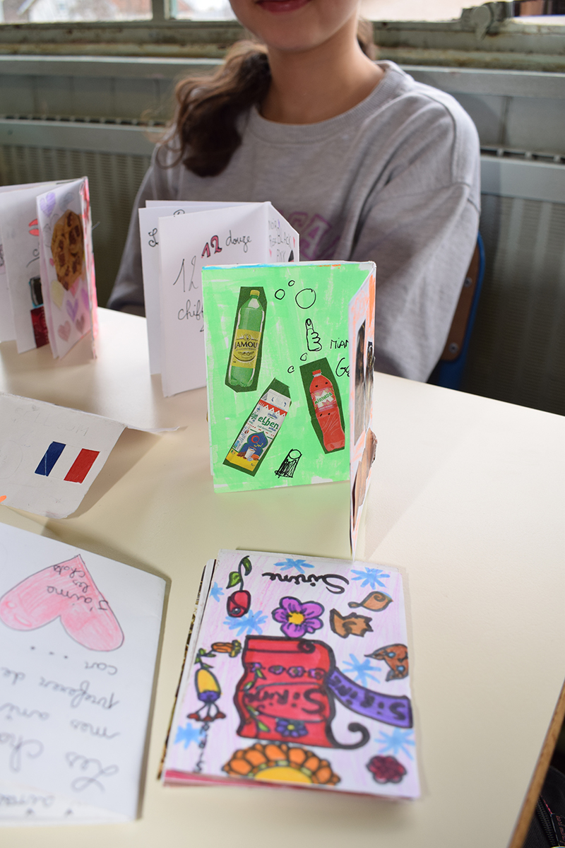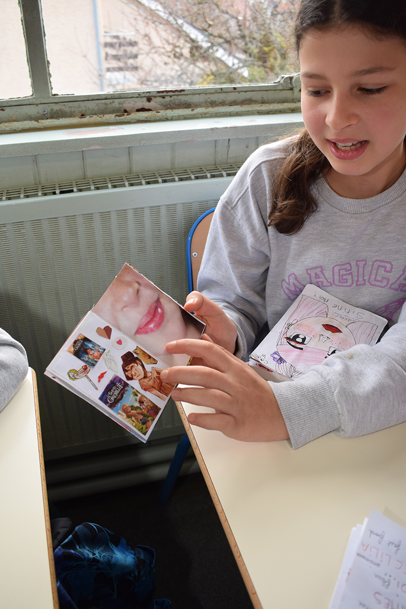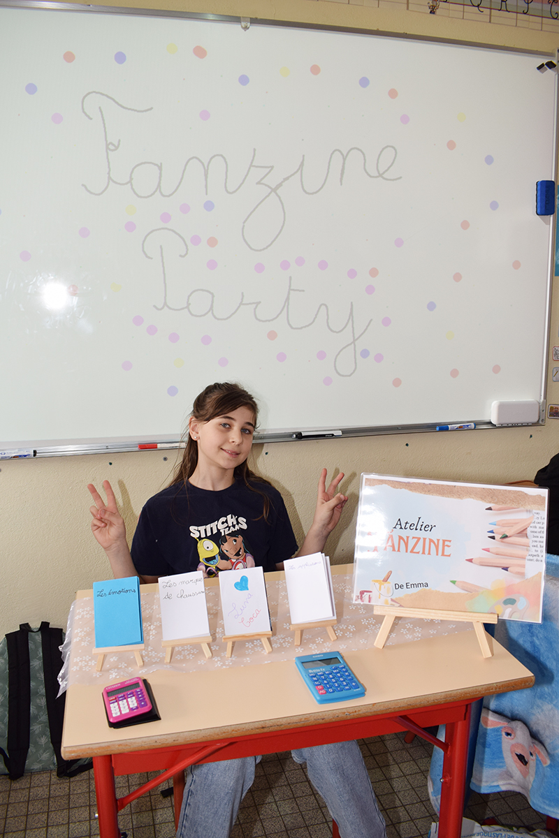 Le parcours s’est achevé avec un mini salon du fanzine organisé dans la classe. Les tables ont été installées comme des stands et à tour de rôle, les enfants ont présenté leurs projets. Ils ont expliqué leurs collages et leurs choix musicaux (tous les morceaux ont été diffusés en fond sonore).